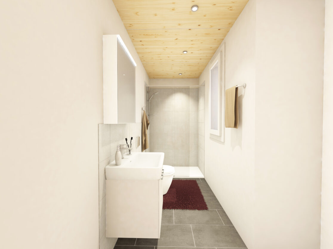 Ein weiteres zentrales Element des Projekts war der Neubau eines Solitärs, der als Nachverdichtungsmaßnahme auf dem Grundstück errichtet wurde. Der Bau orientierte sich dabei an der umliegenden Bebauung. Besondere Herausforderungen stellten die Brandschutzanforderungen, sowie die Verstärkung der bestehenden Holzkonstruktionen, dar, die im Zuge der Baufreigabe umgesetzt wurden. Die bestehende Ölheizung wurde durch eine Erdsondenwärmepumpe ersetzt, um die angestrebte, effiziente Energieversorgung zu gewährleisten.